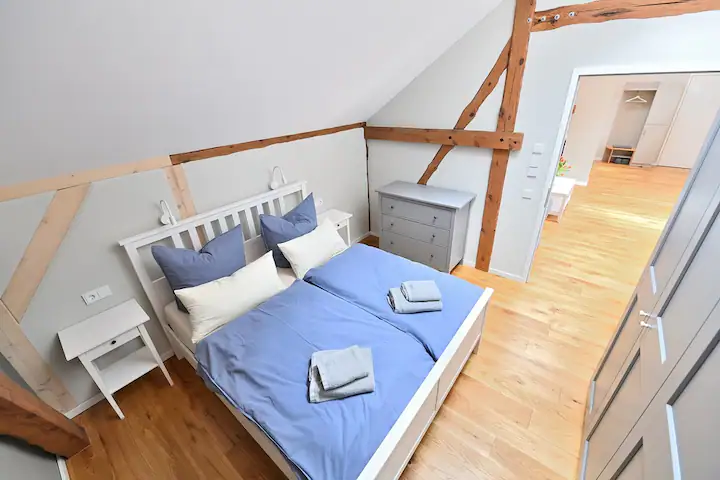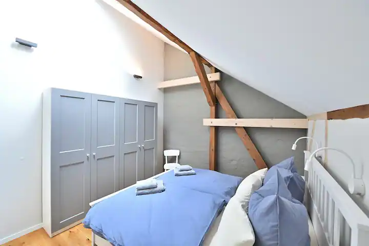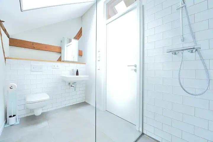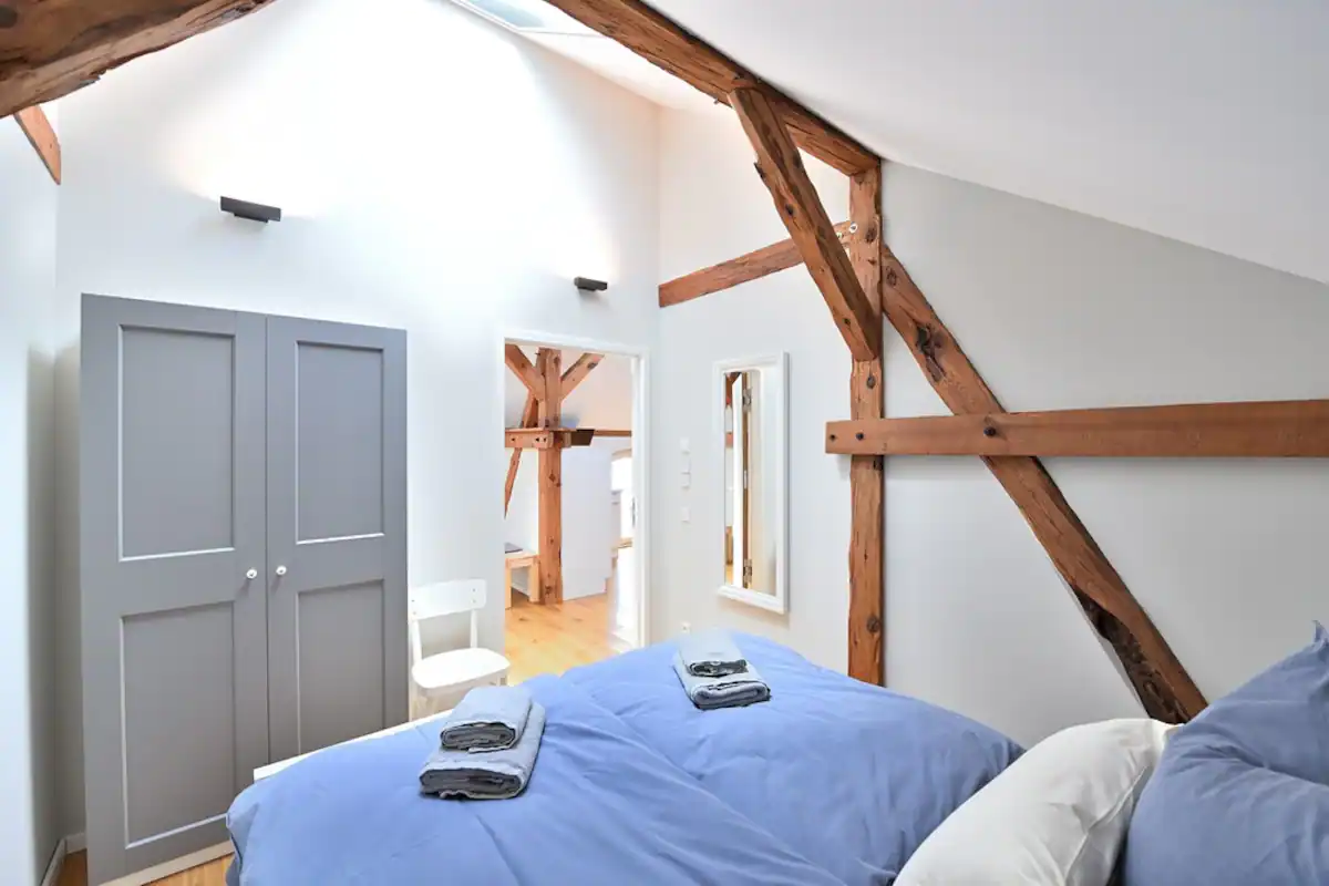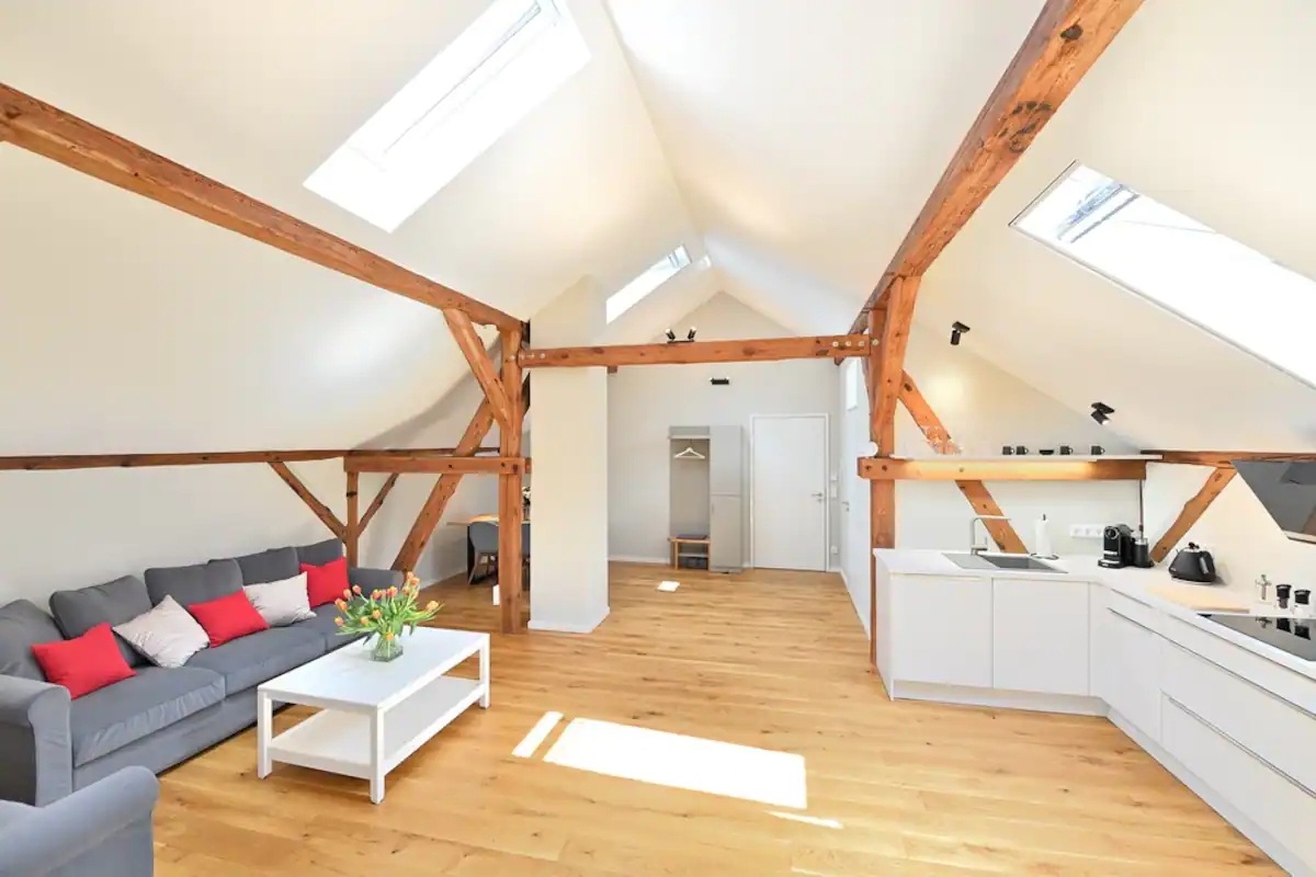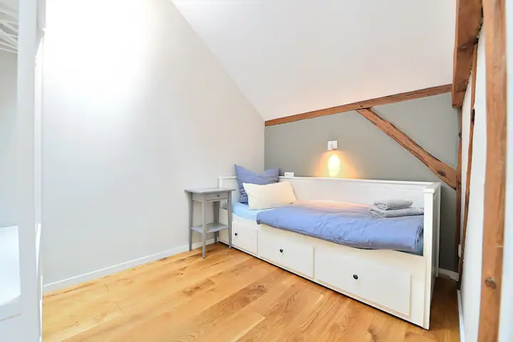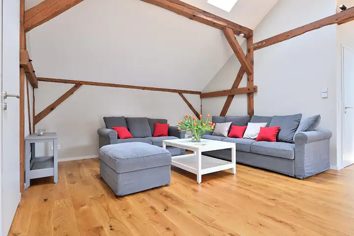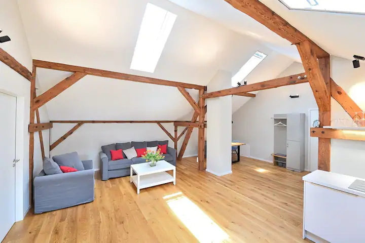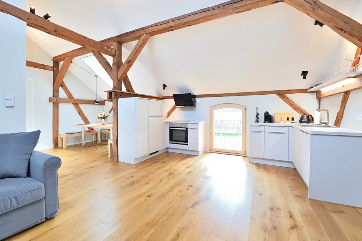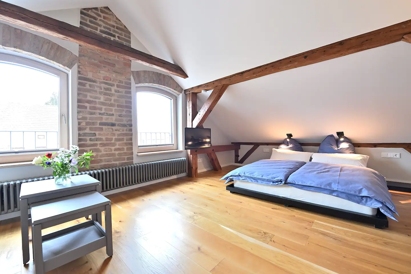 In der Wohnung erkennt man die historische Nutzung nicht zuletzt durch seine Holzelemente, die sichtbar gestaltet wurden und durch einen schlichten Holzfußboden unterstrichen wird. Der Eichenboden wird durch die Fußbodenheizung noch wohliger. Die Räume bietet dir alles für einen erholsamen und entspannten Aufenthalt.