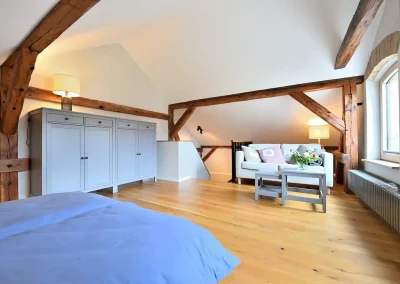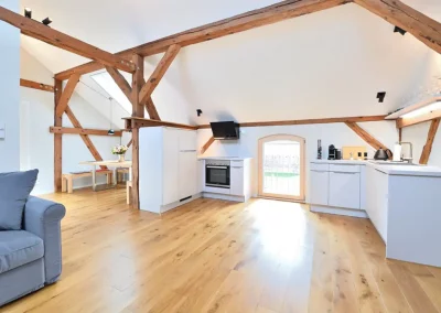 Unsere Kutscherstube findet sich in der straßenseitigen Giebelseite unseres Stallgebäudes und ist naturgemäß, klein (ca. 50qm) und sehr gemütlich. Wir haben hier die Wohnküche und das Bad in der Hochparterre gestaltet und unter dem Dach den Wohnraum. Hier wird gewohnt, gekuschelt und geruht.