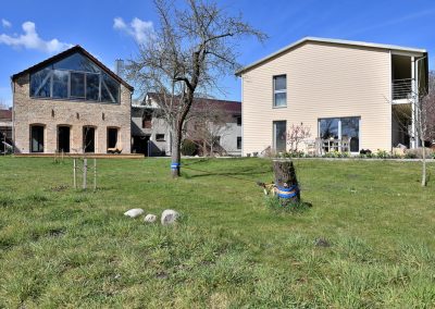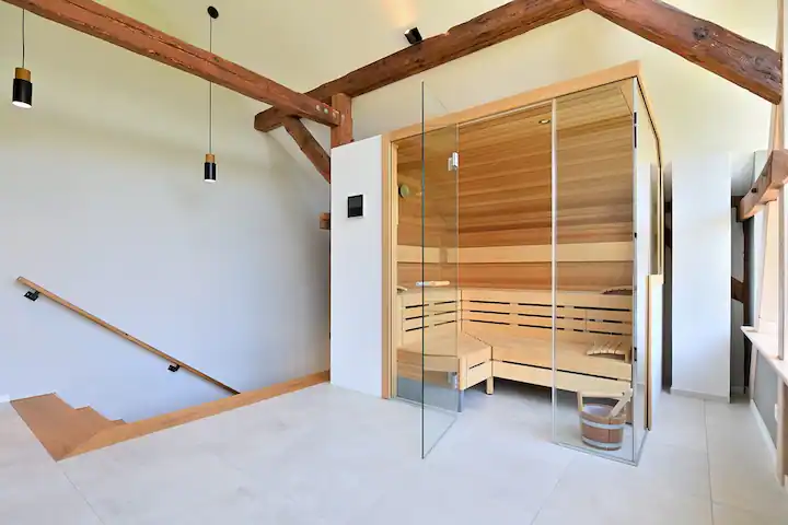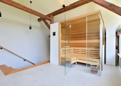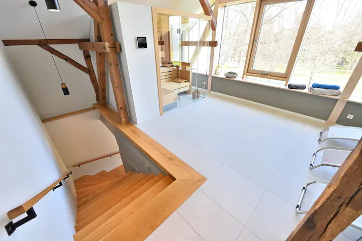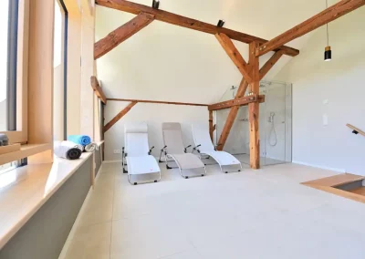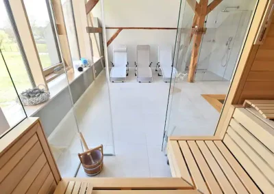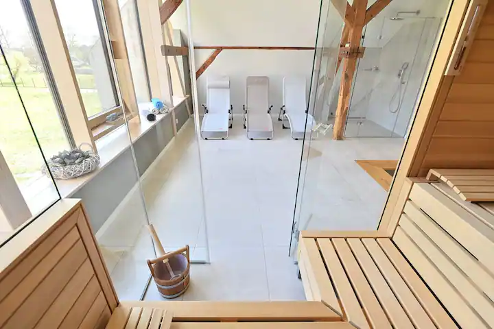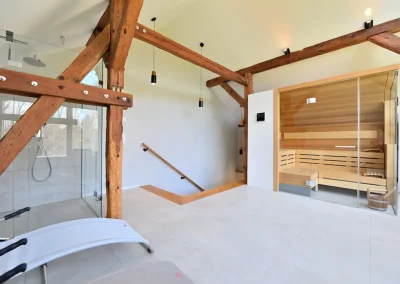 Die Sauna wurde an der Giebelseite des Gebäudes auf zwei Etagen geschaffen. Im Erdgeschoss kann auf der gemütlichen Couch, dem Kamin und dem Zugang zum Holzdeck ausgeruht werden, während im Obergeschoss geschwitzt wird. Die extra große Fensterfront hier oben bietet einen fantastischen Blick auf die Wiese und den wunderschönen alten Baumbestand und sogar auf die Kirchturmspitze. Dieser Platz eignet sich zum Innehalten, Lesen, Meditieren aber auch zum Ausrollen der Yoga-Matte. Natürlich stehen in diesem Bereich auch ein WC und zwei moderne Duschen zur Verfügung.