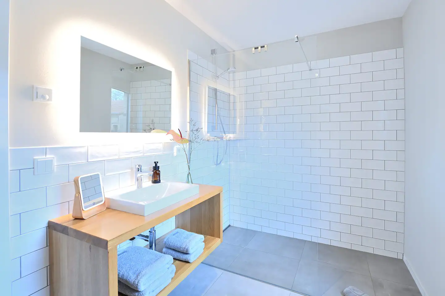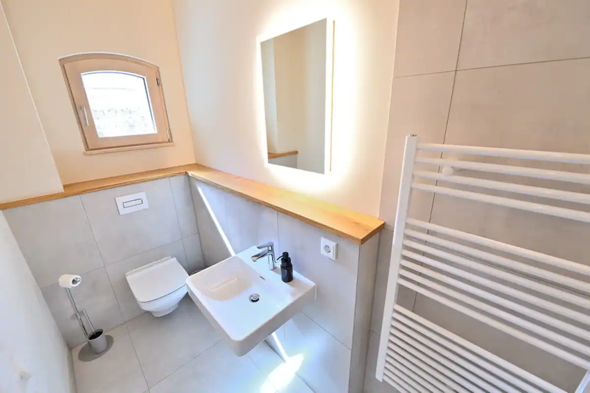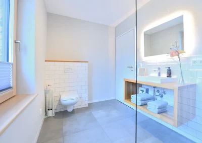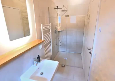 Im Bad ist ein Waschbecken, WC und eine großzügige ebenerdige Dusche verbaut. Das große Fenster bringt Licht und Luft und das dazugehörige Plissee die nötige Privatsphäre.