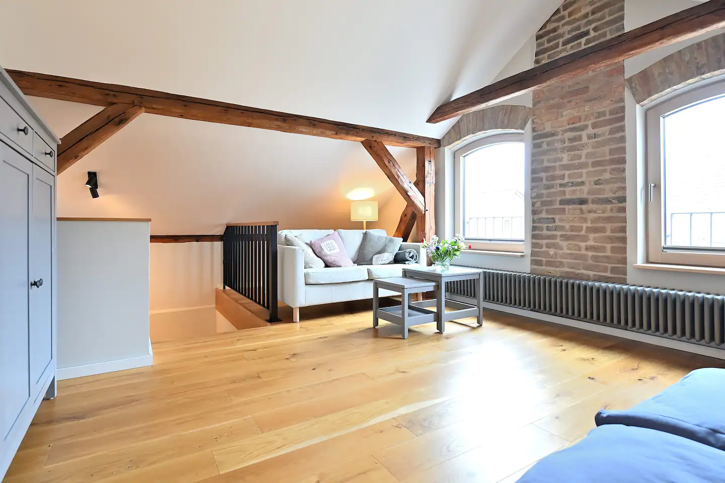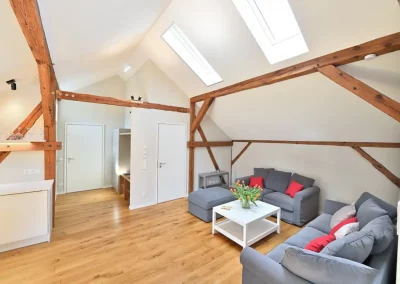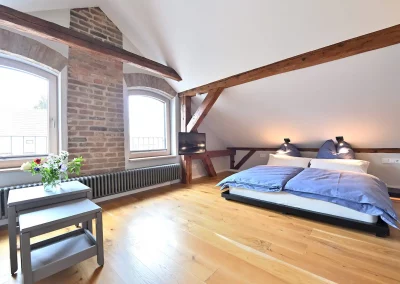 Auch in dieser Wohnung erkennt man die historische Nutzung nicht zuletzt durch seine Holzelemente, die sichtbar gestaltet wurden. Der Eichenboden wird durch die Fußbodenheizung noch wohliger. Die Wohnung ist mit über 70qm großzügig und hell gestaltet.