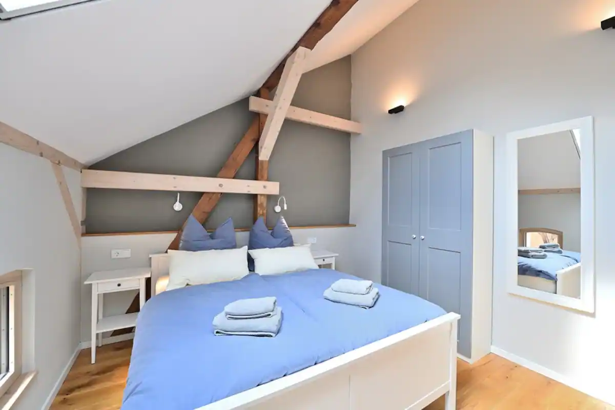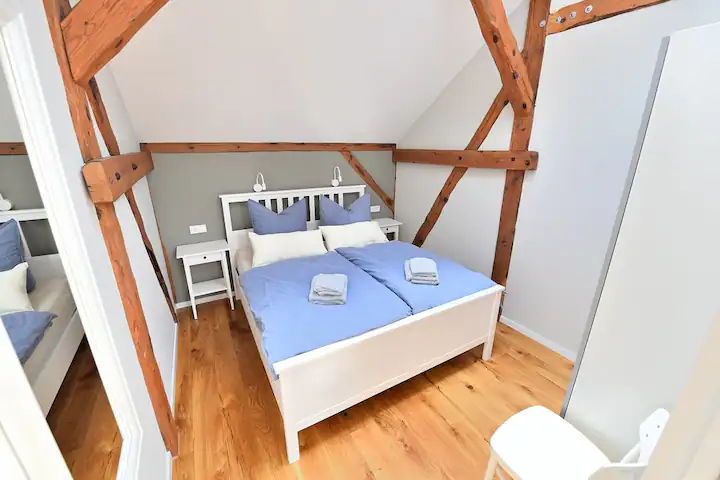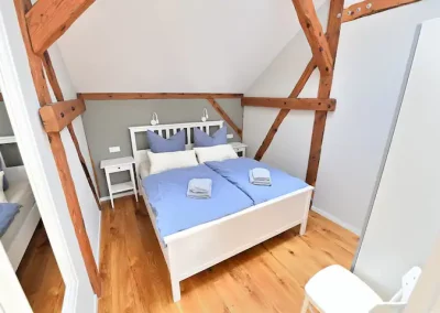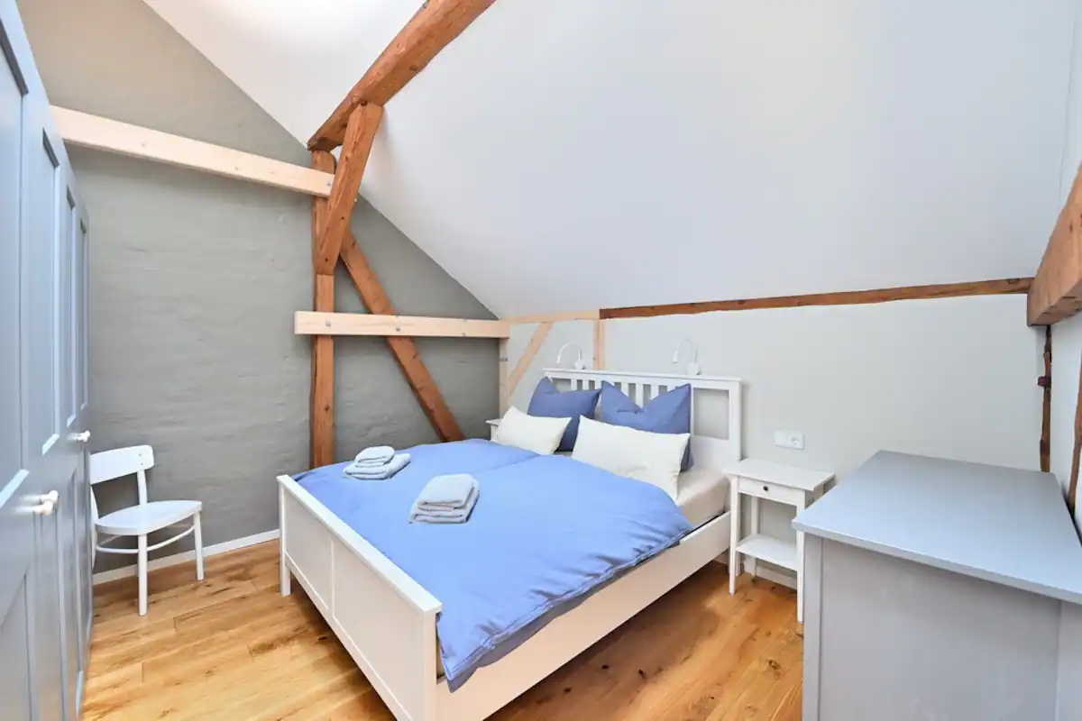 Vom Hof betrittst du ein kleines Treppenhaus, das zwei im alten Heuboden geschaffene Wohnungen erschließt.