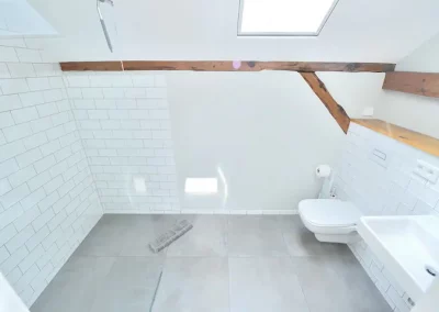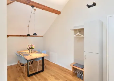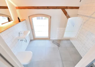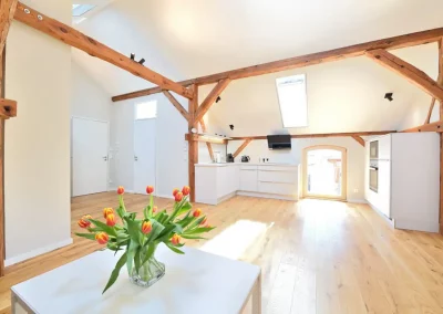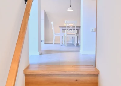 In der Wohnung erkennt man die historische Nutzung nicht zuletzt durch seine Holzelemente, die wir absichtlich sichtbar gestaltet haben und durch einen schlichten Holzfußboden und im EG Fliesenfußboden unterstrichen wird.