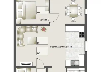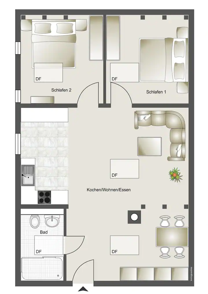 Die zweite großzügig geschnittene 3-Zimmer-Wohnung bietet zwei Schlafzimmer, ein Bad und einen großen offenen Wohnbereich samt Küche und Essbereich.